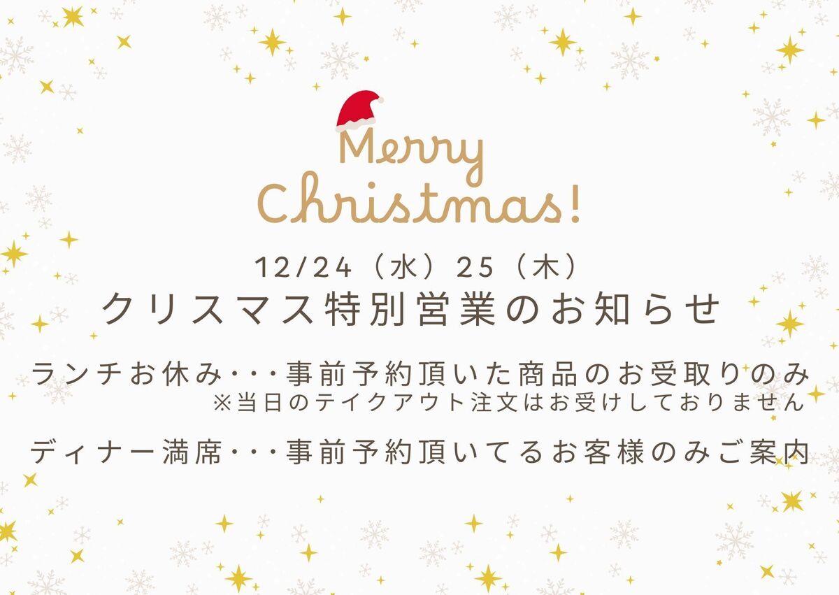 クリスマス期間12/24(水)・25(木)の営業は上記の通りとなります。