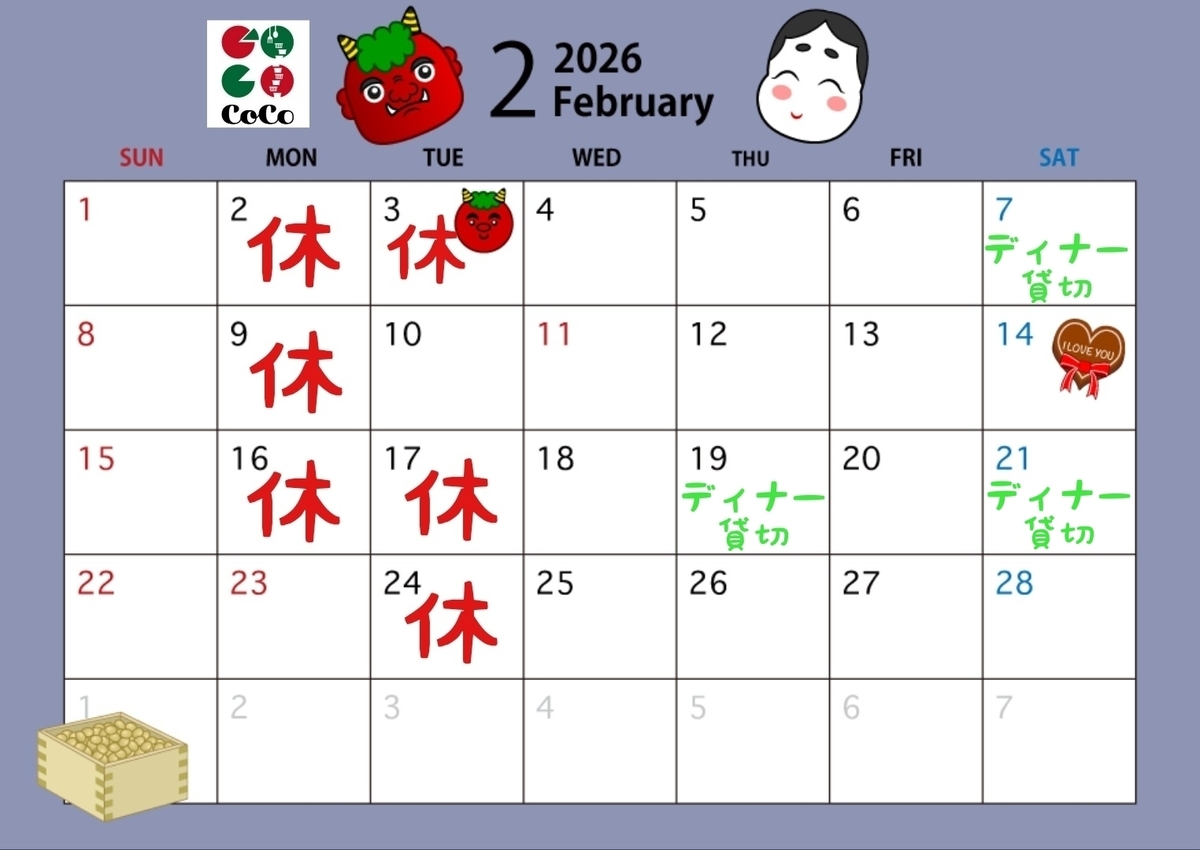 2月の営業カレンダーに修正がございましたので再掲載いたします。
