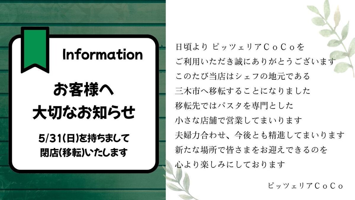 平素より「ピッツェリアCoCo」をご利用頂き、誠にありがとうございます。