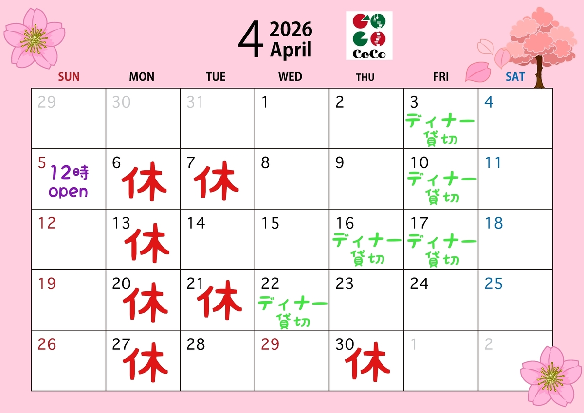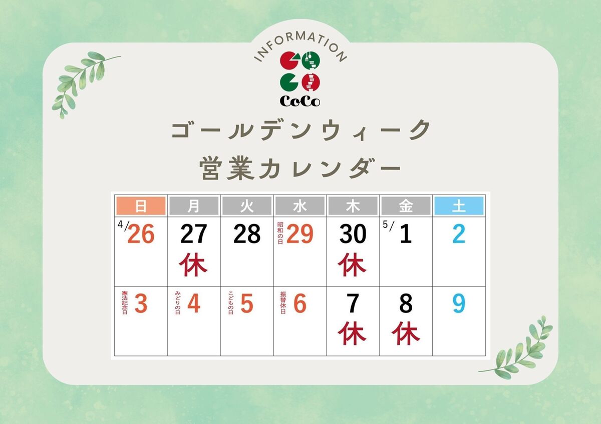 4月<修正版>とゴールデンウィークの営業カレンダーでございます。