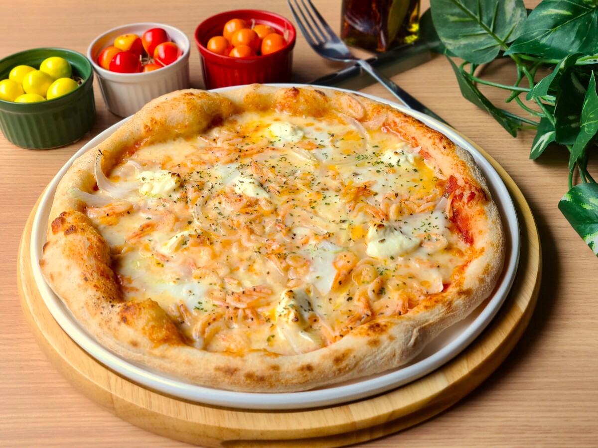 ピザは”ノーマル生地”「淡路産新玉ねぎと桜エビの4種のチーズピザ」、